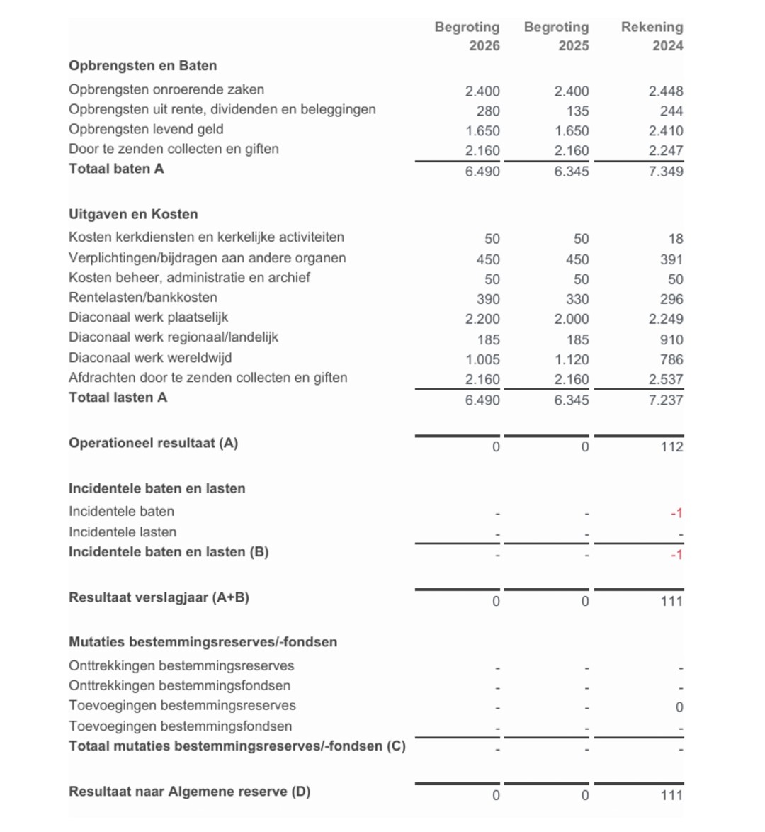 ontvangsten en de voorgenomen bestedingen van de diaconie in het verslagjaar. De kolom rekening