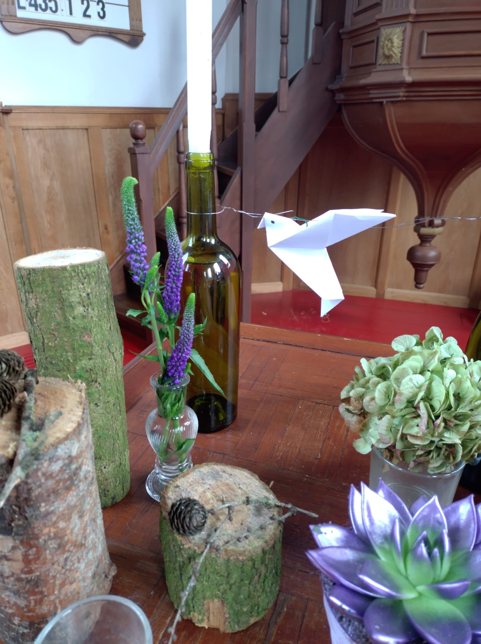 Tussen de eerste en de tweede kandelaar zweeft een enkel duifje.