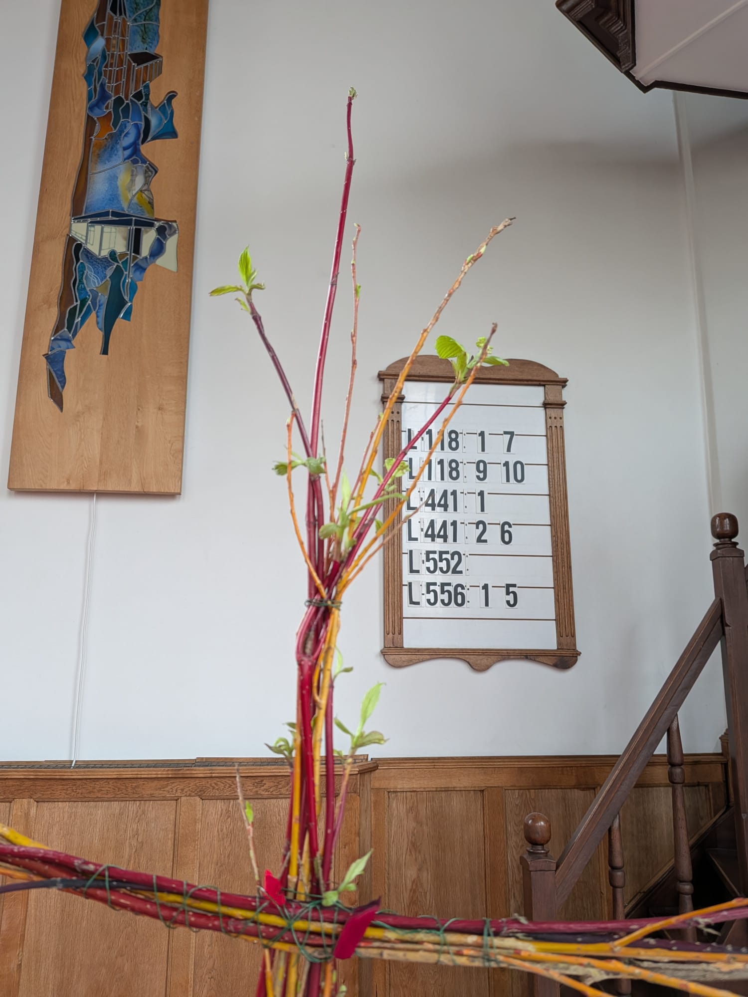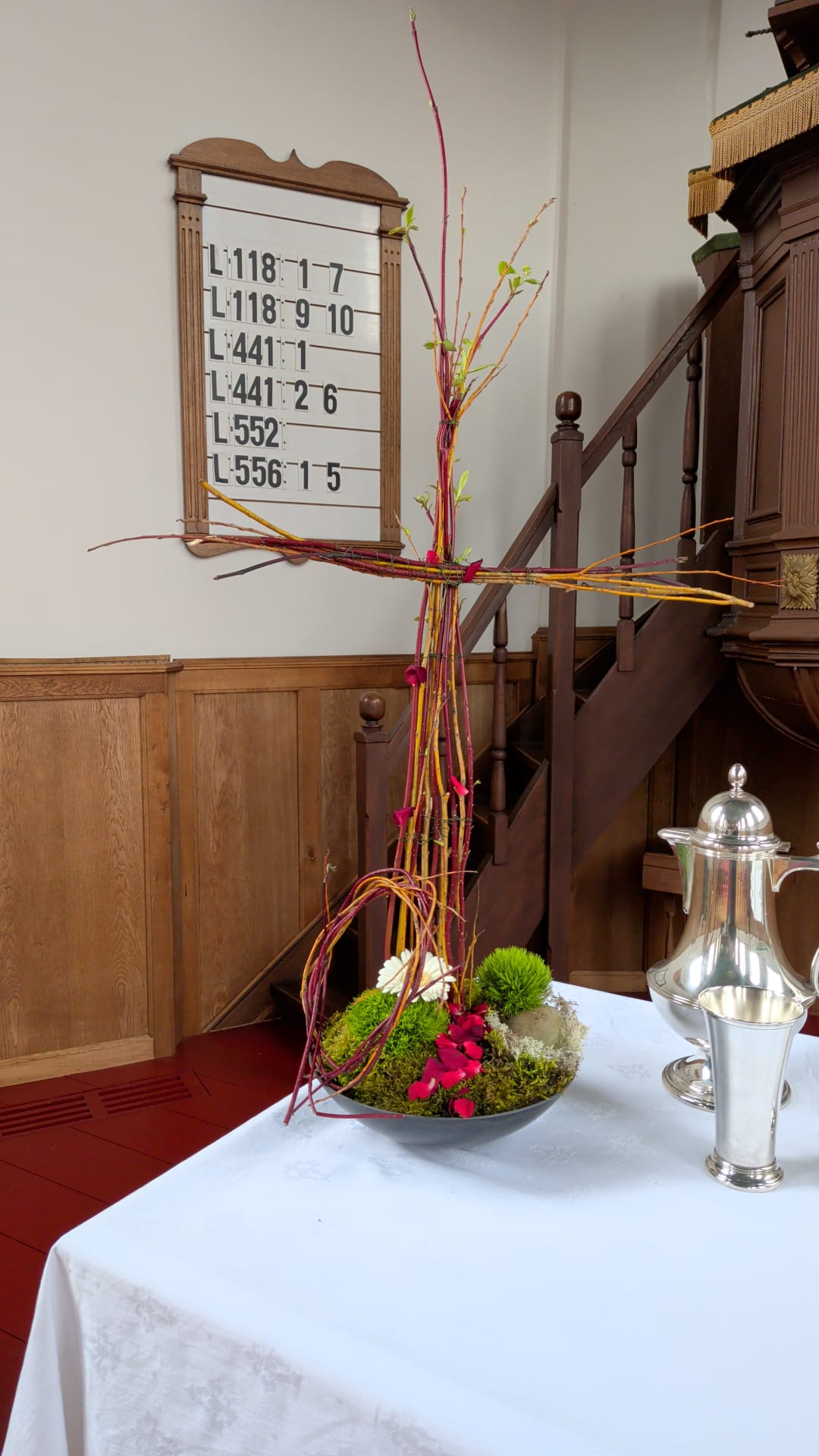 Per abuis is op de vorige nieuwsbrief de aanvangstijd van de dienst van vanavond niet goed vermeldt. De dienst begint vananavond om 21 uur ![]() Liturgische schikking Het kruis en de doornenkroon zijn gemaakt van gekleurde takken, wat staat voor alle mensen in de samenleving. Rozenblaadjes zijn de weg naar het graf. Aan het kruis ontspringen groene blaadjes als teken van nieuw leven. ![]() Paasmorgen 5 april, ontbijt en feestelijke dienst